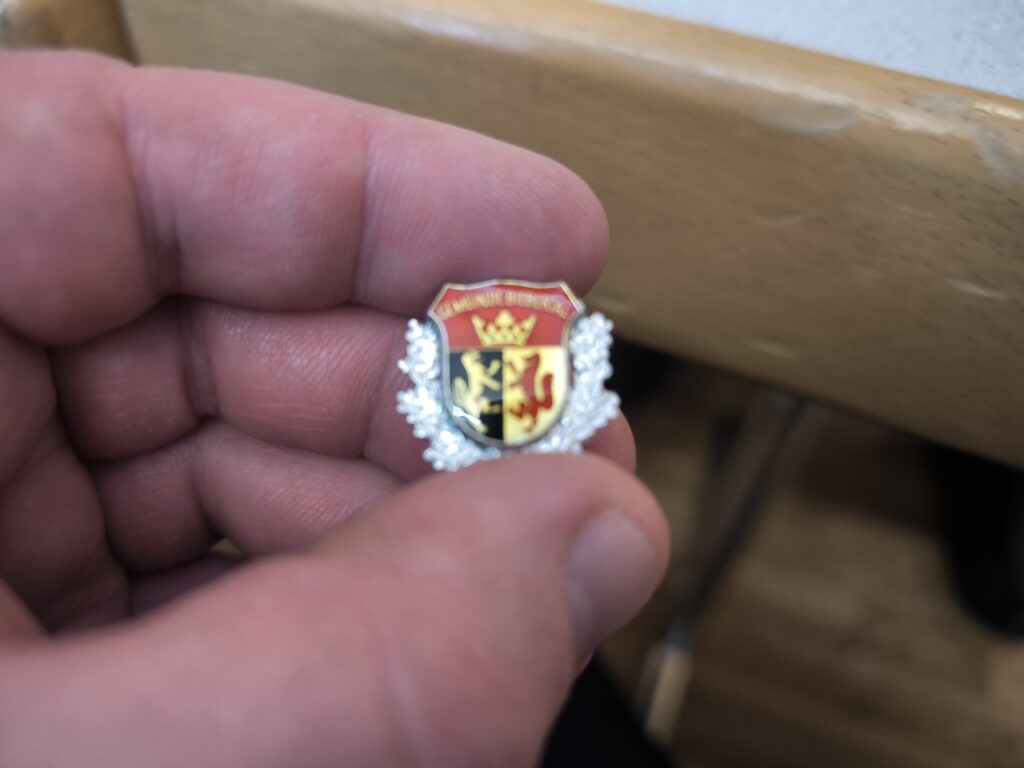 Oben die Anstecknadel, die den Geehrten als sichtbares Zeichen des Respekts und des Dankes ans Revers oder den Pulli gesteckt wurde.