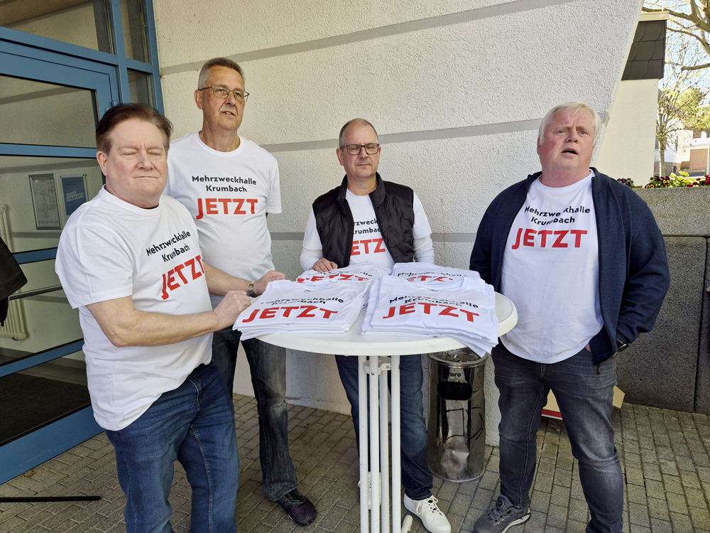Die Krumbacher übergaben allen 27 GemeindevertreterInnen sowie der Bürgermeisterin ein T-Shirt mit dem Aufdruck “ Mehrzweckhalle Krumbach JETZT“. Es war sogar in vier Größen vorhanden. Sage also niemand hinterher, er/sie habe nicht davon gewusst.